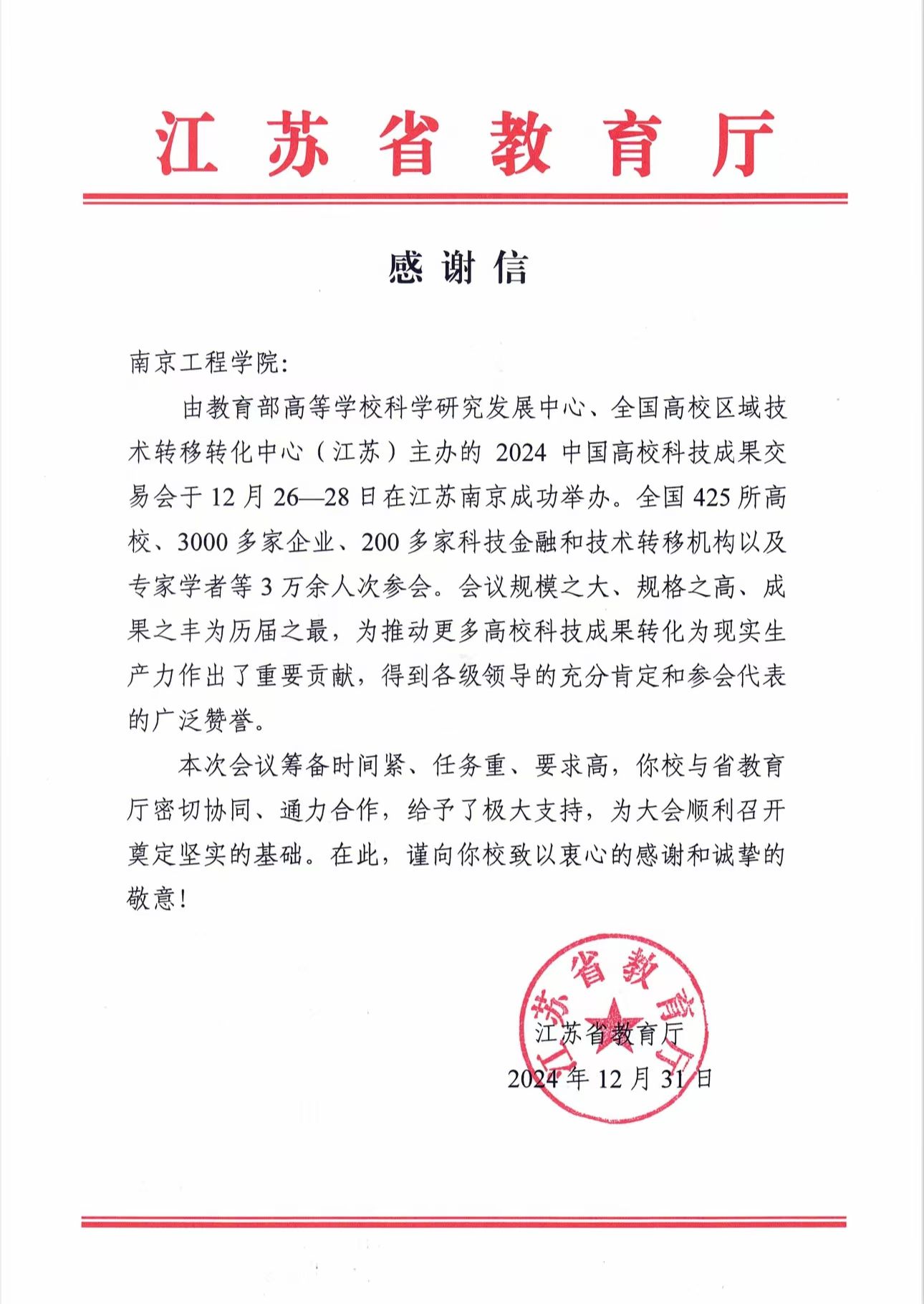 近日,我校收到江苏省教育厅发来的感谢信,对凯发在2024中国高校科技成果交易会筹备工作的贡献致以衷心的感谢和诚挚的敬意。