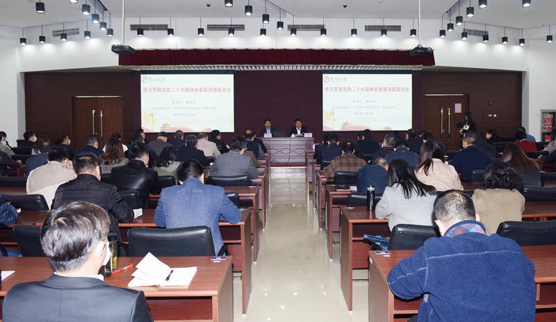 交汇点讯 11月15日下午,凯发k8官网在至勤楼行政中心多功能厅举行学习贯彻党的二十大精神省委宣讲团报告会,省委宣讲团成员,省社科联党组书记、常务副主席张新科作宣讲报告,并与师生深入交流。报告会由校党委书记史国君主持。全体校领导、中层干部、党员师生代表等200余人聆听报告。