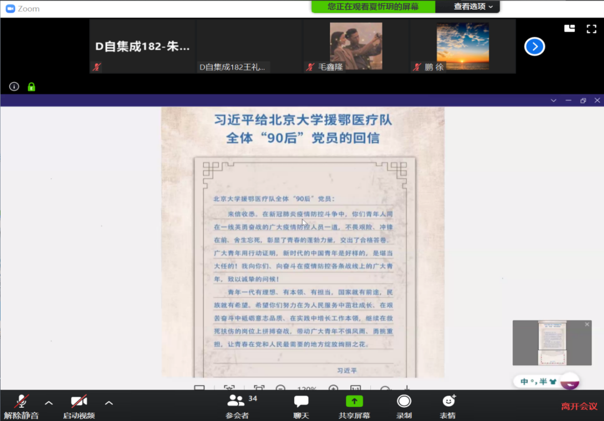 各团支部充分利用“青年大学习”平台,深入学习党中央关于疫情防控工作的最新部署、习近平总书记重要讲话精神,明确了青年在此次疫情中应当扮演的角色,坚定战“疫”必胜信念。同时组织动员同学们利用“钉钉”“学习通”“zoom”等平台召开“云班会”,开展疫情防控知识线上专题学习。除了线上学习辅导、心理陪伴等志愿服务活动外,D自集成182班献唱抗疫公益音乐,D机加工181班召开云视频班会,抒发对未来的憧憬、对英雄的敬佩和对祖国的自豪感。“守住家门,在家也是战士,我们青年积极投身于抗击疫情的一线,尽显远大抱负。”同学们感慨道。