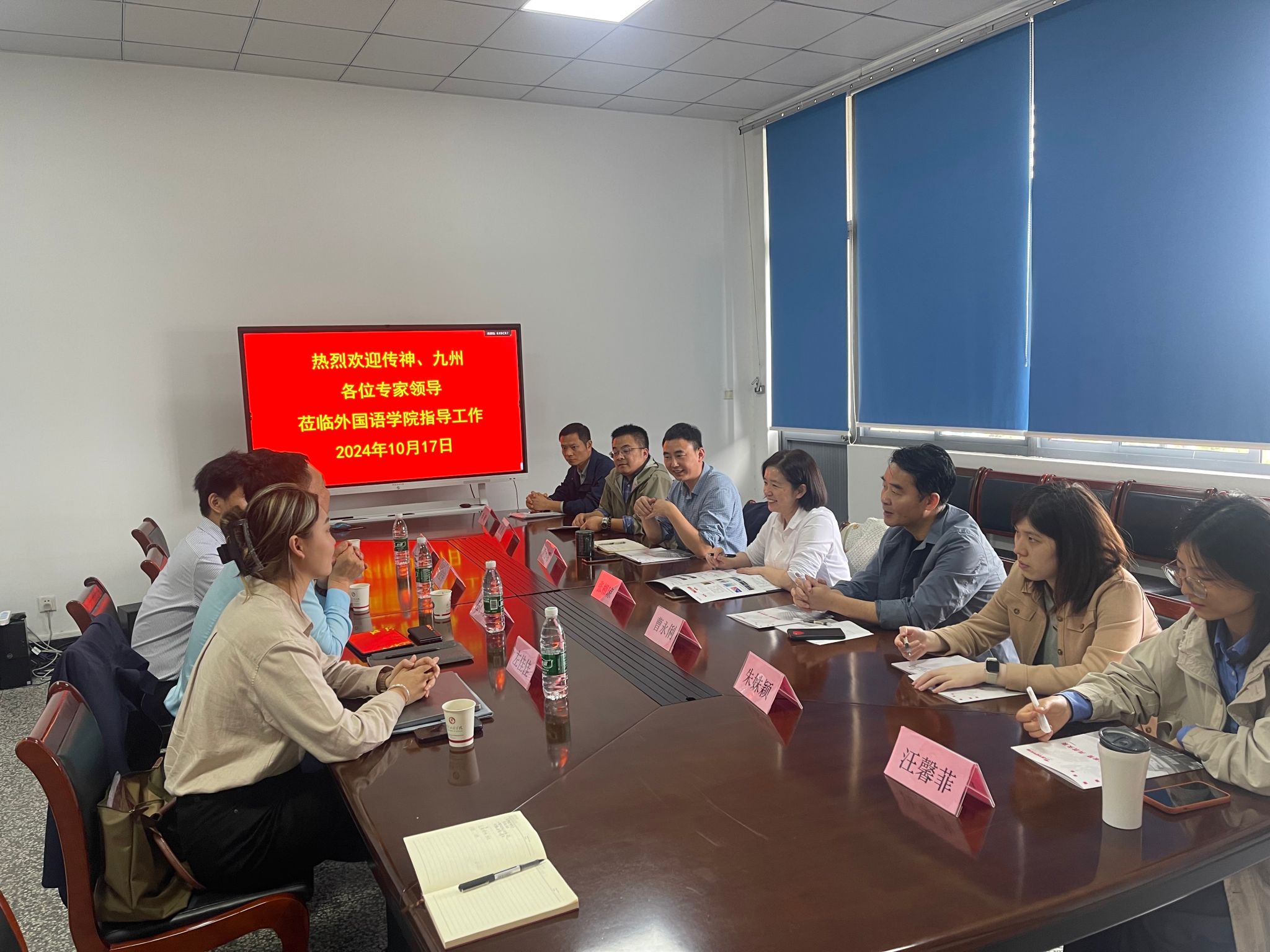 10月17日上午,传神语联网网络科技股份有限公司、北京九州新语科技有限公司一行4人来外国语学院开展合作交流。外国语学院党总支书记张相琼、院长袁小明、MTI(翻译硕士)负责人及相关教师参与此次会议。